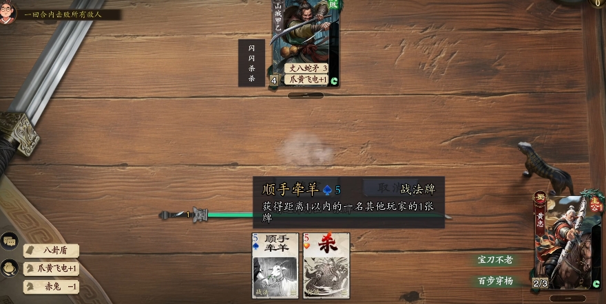 07:本关则考验玩家的资源获取与利用能力,先对山贼使用顺手牵羊,不仅能获得武器丈八蛇矛,还能装备它并摸两张杀,同时弃置己方的-1马,为后续的攻击做准备,然后对山贼打出杀,触发强大的技能百步穿杨的卡牌效果,实现强命效果一举击败山贼。