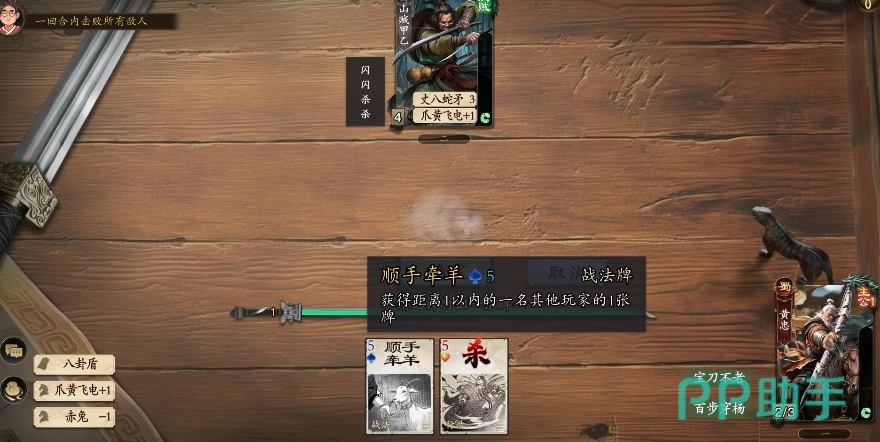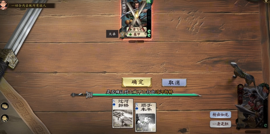 10:这一关考验的是玩家的资源管理,先过河拆桥拆掉山贼的+1马,削弱其防御能力,然后使用顺手牵羊顺走山贼的火杀,为后续的攻击做准备,最后对山贼打出火杀,凭借前期的削弱和当前的攻击力优势,一举击败山贼。