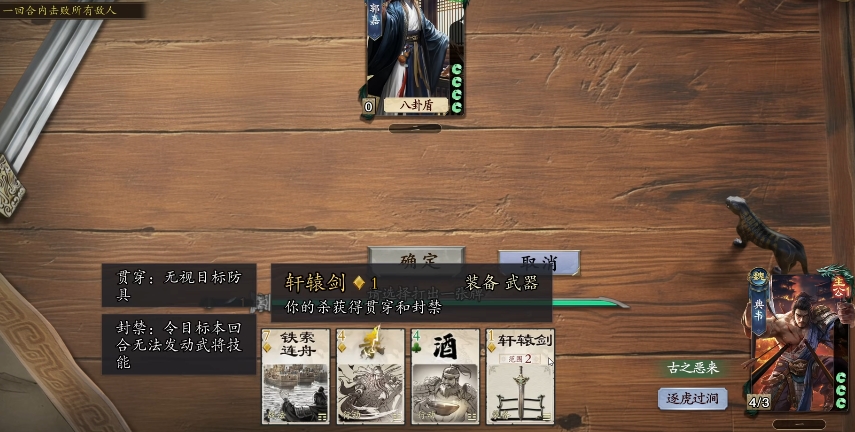 03:这一关则需要玩家精心策划连锁攻击,先装备上传说中的轩辕剑,并对典韦、郭嘉使用铁索连环这张卡,将他们相连,随后喝酒壮胆,对郭嘉打出雷杀,紧接着利用技能逐虎过涧,弃置武器轩辕剑,选择与郭嘉交换位置,同时触发技能特效,对郭嘉造成致命一击,由于典韦的被动技能古之恶来加成,实际伤害更为可观,这一关的精髓在于巧妙组合技能与武器,创造出意想不到的连锁效果。