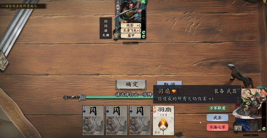 04:本关玩家需要运用地形优势和武将特色技能,先向山贼使用水淹七军,巧妙弃置3张闪,削弱其防御,然后借助关羽大人的威震华夏之力,发动武圣技能,将手中的羽扇当作杀打出就差不多啦。