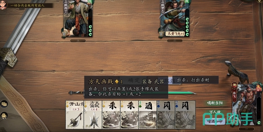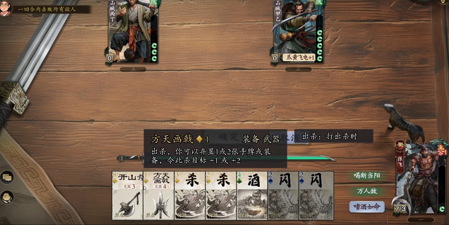 08:这一关需要玩家精心策划连锁攻击,先装备上方天画戟和开山斧,增强自身攻击力,然后喝酒壮胆,对山贼甲乙丙丁同时发起攻击,打出杀并弃1张闪触发方天画戟特效额外选定山贼为目标,再弃1张闪触发开山斧特效加伤,结算完成后山贼甲乙受重伤,山贼丙丁则直接死亡,此时张飞触发技能万人敌特效,出杀次数+1,对山贼甲乙再次打出杀,并弃置方天画戟触发开山斧特效加伤,最终获胜。