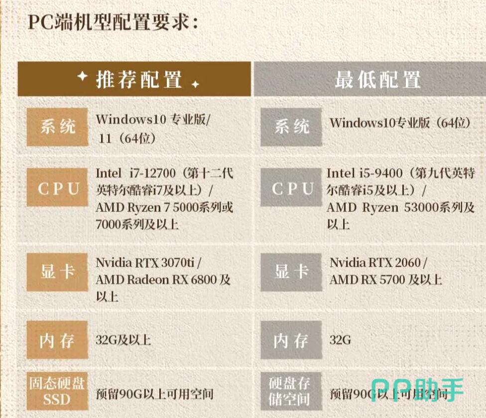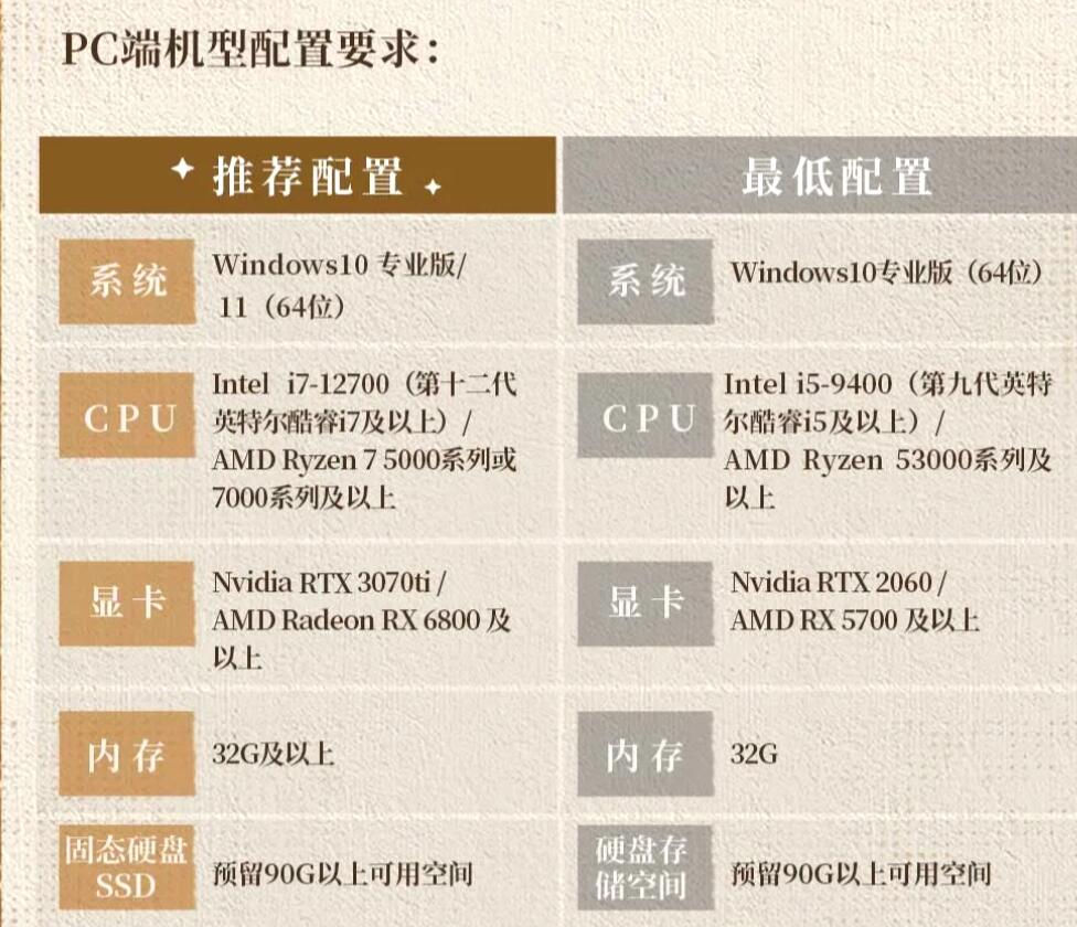 作为支持手机、PC跨端互通的作品,其PC端标准已对标次世代单机级渲染规格。最低系统要求为Windows 10 64位操作系统;CPU需Intel Core i5系列或更高型号;显卡须达到NVIDIA GeForce RTX 2060或AMD Radeon RX 5700水平;内存容量不得低于32GB;硬盘需预留不少于90GB的可用空间——此为可启动并完成主线流程的基准线。