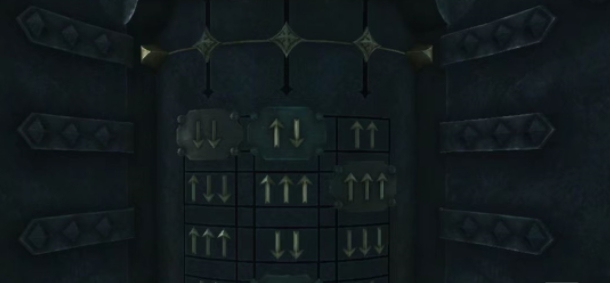 而且通过拖拽双头拉杆两侧的滑块,玩家可以获得一个铰轮机关部件,带着这个部件下楼,并将其插入等待中的凹槽里,旋转铰轮之后装置便会被推出,这里大家需要找到对应的铁片位置并旋转金属环,将木桶上的铁片向上滑动,移动滑块之后将每一列的向上箭头数量与向下箭头数量相等。