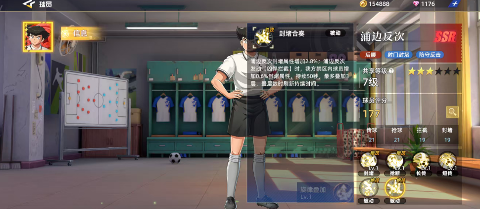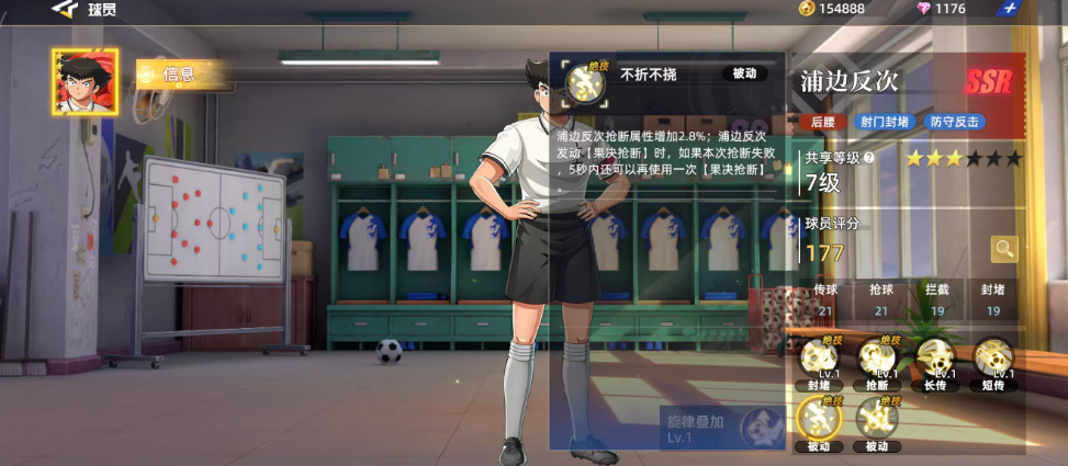 从属性分布来看,浦边反次的传球与抢球能力均达到21分,拦截和封堵能力为19分,虽略低于前两者,但实际效果仍优于多数非SSR角色。六维图中最薄弱的是进攻能力,而预判属性高达28分,结合其封堵特性,使他在长短传调度方面也具备不俗表现。在主动技能中,“果决抢断”可执行一次威力为65.6%的抢断动作,成功后将提升自身32.8%的盘带属性,持续时间为10秒,为后续控场提供有力支持。