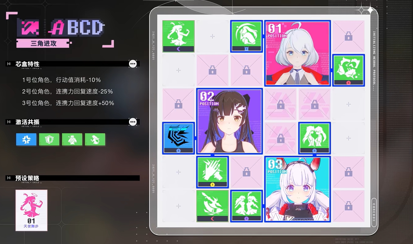 “心得卡”需装配于专属系统“芯盒”中生效,每张卡片对应特定链接策略。当多张心得卡满足预设链接条件时,可触发额外团队增益或角色专属加成。玩家可在战前自由调整芯盒配置,实时优化战术组合;战斗过程中亦可下达即时指令,动态切换攻击模式、技能释放节奏与协同逻辑,实现策略深度与操作反馈的双重结合。