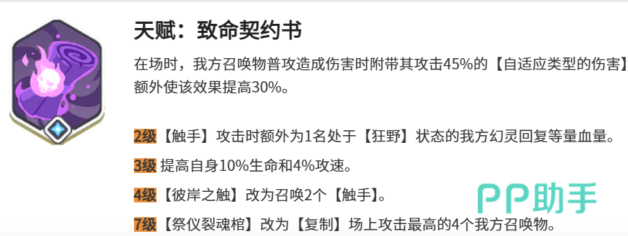 丝碧莫基础体型数据为身高166cm、体重45kg。其核心定位围绕“治疗+召唤协同”展开。天赋【致命契约书】赋予我方所有召唤物普攻附加45%自适应伤害;该效果随攻击加成动态强化——每提升10%攻击,额外伤害增幅达30%。天赋等级提升后,触手攻击可为处于狂野状态的幻灵恢复生命值,并同步提升攻击速度与自身最大生命值。当天赋升至7级,可复制场上攻击力最高的4个友方召唤物,生成满血复刻体,显著扩大战场控制面与持续输出能力,成为关键团战翻盘支点。