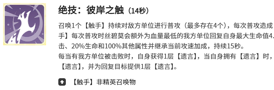 绝技【彼岸之触】是丝碧莫续航体系的核心枢纽。冷却时间14秒,召唤触手持续15秒,继承本体80%攻击力、100%其他属性及20%最大生命值。触手每次攻击造成50%魔法伤害,并自动为我方生命比例最低单位恢复其最大生命值的4.1%。当有队友阵亡时,触发【遗言陈述】机制,使触手后续攻击所附带的治疗效果可转移至指定受疗目标,大幅提升残局容错率。被动技能【暗影滋养】则构建成长性优势:每当己方召唤物阵亡,丝碧莫永久获得4%攻击速度与2%最大生命值加成,越战越强,契合长线消耗型阵容需求。