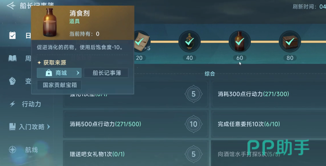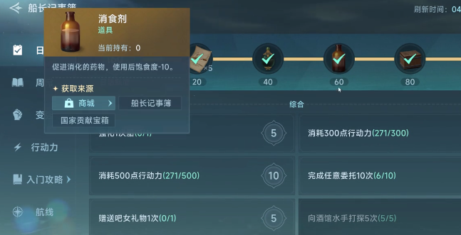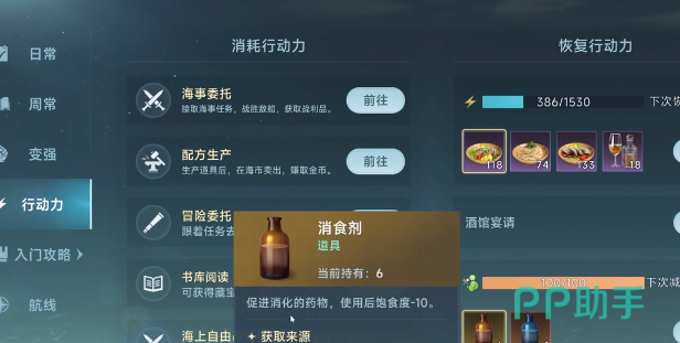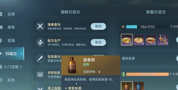要想补充行动力,那主要的方法就是吃料理,在吃完之后就可以迅速的恢复。不过吃料理还可以增加饱食度,一旦在增加之后就不能再吃。此时就可以用消食剂来有效降低保湿度,基本上一瓶消食剂就可以降低10点。