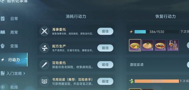 每吃一个料理就可以额外的增加五点饱食度。因此尽可能选择一些高级料理,有些高级料理每一分就能够获得16点行动力,17点行动力。除了吃料理还有喝饮料之外,行动力也可以自然恢复。在游戏中还会有恢复倒计时,每一次倒计时结束就可以获得一点行动力。