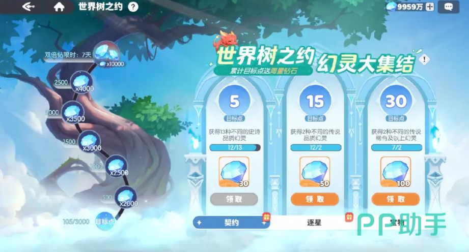 “世界树之约”为角色创建28天内专属成长计划。达标后可领取10000钻石,但需注意:该奖励设有倒计时机制,逾期未领取将自动降级为5000钻石。建议玩家在创建角色后及时关注进度条,确保全额资源到账。