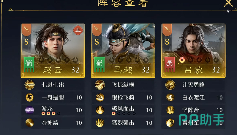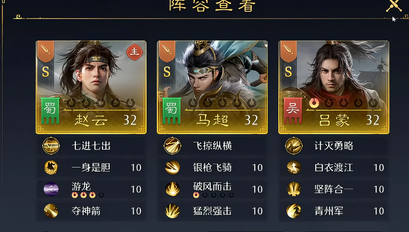 针对千人战场景,推荐组建高爆发骑兵突击阵容:核心主将选用赵云,其专属机制可在战斗中持续提升自身攻击力,并触发高频反击效果,确保全程输出稳定在线;副将配置马超与吕蒙,二者均为骑兵系武将,具备兵种属性加成与极速突进能力,能与赵云形成三重冲锋节奏,快速穿透敌方阵列,有效扩大战果并提升个人奖励获取量。