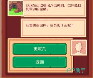 接下来通过深入虎穴就可以获得最强武器ex咖喱棒的素材。玩家在游戏当中需要选择把手伸进去,就可以触发一个超精心动魄的故事剧情,而在触发故事剧情后又会为你提供五个不同的选项,分别为知识,激情,财富进步和没什么,而在游戏当中知识所指代的就是探索,激情指代的是战斗,财富指代的是采集,而进步则是指代的建造,每一次付出一样时,你的全体成员就会失去10点。