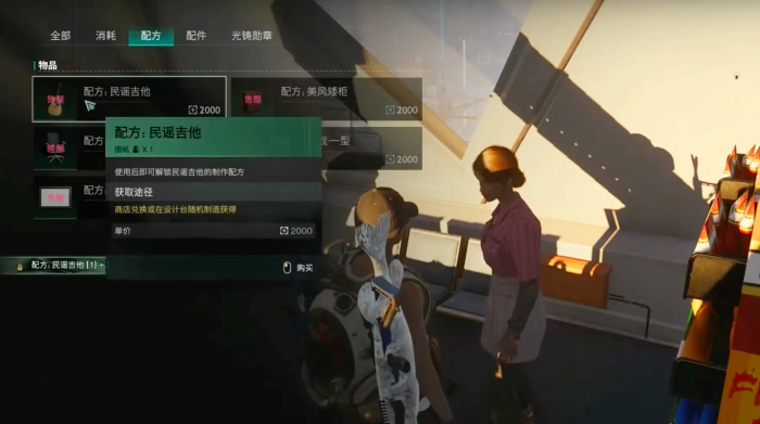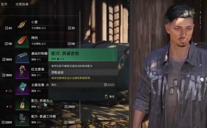 配方的第二个获取位点是在旅人营地,玩家需要在女人营地当中找到韦伯,韦伯在一棵木桩之下,在他手里同样需要花费2000货币,可以购买到其他配方,而之后的操作与上文相同,可以前往工作台制作,之后就可以使用了,吉他的操作方法非常简单,是由三行音阶组成,玩家还可以对吉他的音量,以及音调高低进行自行调节,演奏出更多独一无二的乐曲,小伙伴们赶紧来试一试吧。
