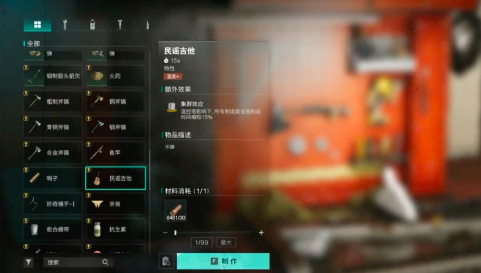 有了配方之后,玩家就可以回家前往工作台制作吉他,吉他的制作材料是30个木头,接下来直接装备到快捷栏当中,按一下就可以进入到演奏状态了,根据曲谱来拨动对应的音符,就可以演奏出好听的音乐。除此之外,还可以在装备系统当中对民谣吉他的皮肤,进行再度打造,使吉他外观看起来更具个性化。