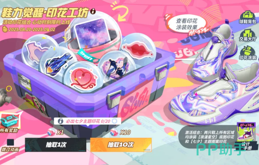 活动时间从8月20日持续至9月2日,在这段时间里,玩家不仅能享受街头对决的速度与对抗,还能沉浸在专为七夕打造的浪漫主题之中。其中最引人注目的玩法当属“鞋力觉醒·印花工坊”。通过使用印花解码蛋参与抽奖,最多20次必得一款限定七夕印花。这次共上线六款全新设计,包括浪漫星空、爱心喜鹊、红绳、流星等元素,每一款都承载着爱情的美好寓意。