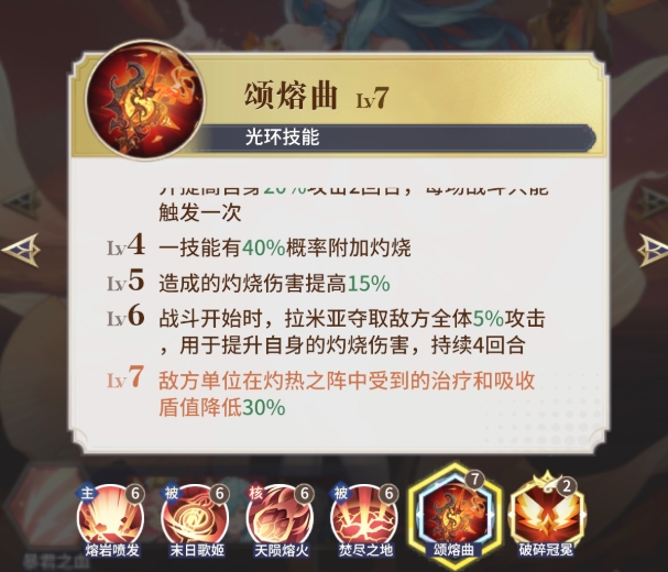接着看看拉米亚的技能有哪些:主动技能是一个群攻技能,可以给全体敌人造成火属伤害,并附有额外的灼伤状态。这个技能是非常适合在前期快速压制敌人,配合队友打出高额伤害。拉米亚的被动技能是偏辅助的,可以给自己这边的角色提高暴击能力和攻击,并且可以持续五个回合。这个技能可以极大程度的增加队伍战力水平,适合打持久战战局。