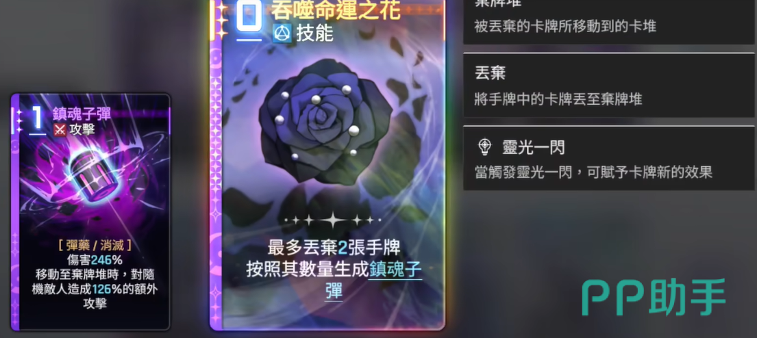 除基础输出外,其卡组具备显著的资源联动特性。“灵光一闪”是唯一达成150%伤害倍率的卡牌,且每弃置一张手牌,即提升50%对地伤害;第二张卡则依据当前手牌中子弹类卡牌数量,每张额外增加50%伤害;第三张卡在满足条件时可触发180%基础伤害,并在弃置后按弃牌数随机生成子弹卡——这种多重叠加机制,使黑玫瑰诗人在中后期配合卡序规划与弃牌节奏,能稳定触发多层增益,形成阶梯式伤害跃升。