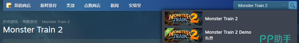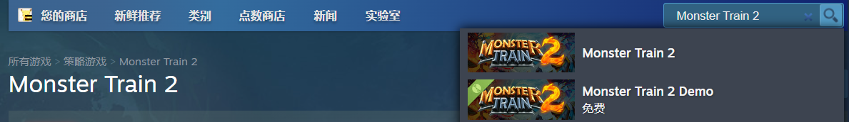 《怪物火车2》的Steam官方名称为《Monster Train 2》,注意是不支持中文搜索的,因此最好直接复制这一英文名,就可以在平台上直接通过搜索功能找到游戏页面了。而且输入后等待1秒左右就会有预览浮窗了,如果等了很久都没有预览,那可能就是网络太差了,这样的话即便点击搜索也可能刷不出页面的。