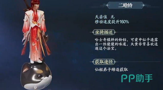 二哈铃以哈士奇形象为原型打造,铃铛造型俏皮又带点呆萌气质。值得注意的是,游戏中宠物大黄会对这款坐骑表现出特别的兴趣,常会追逐其移动轨迹。获取途径同样是通过仙枢弟子缔造流程解锁。