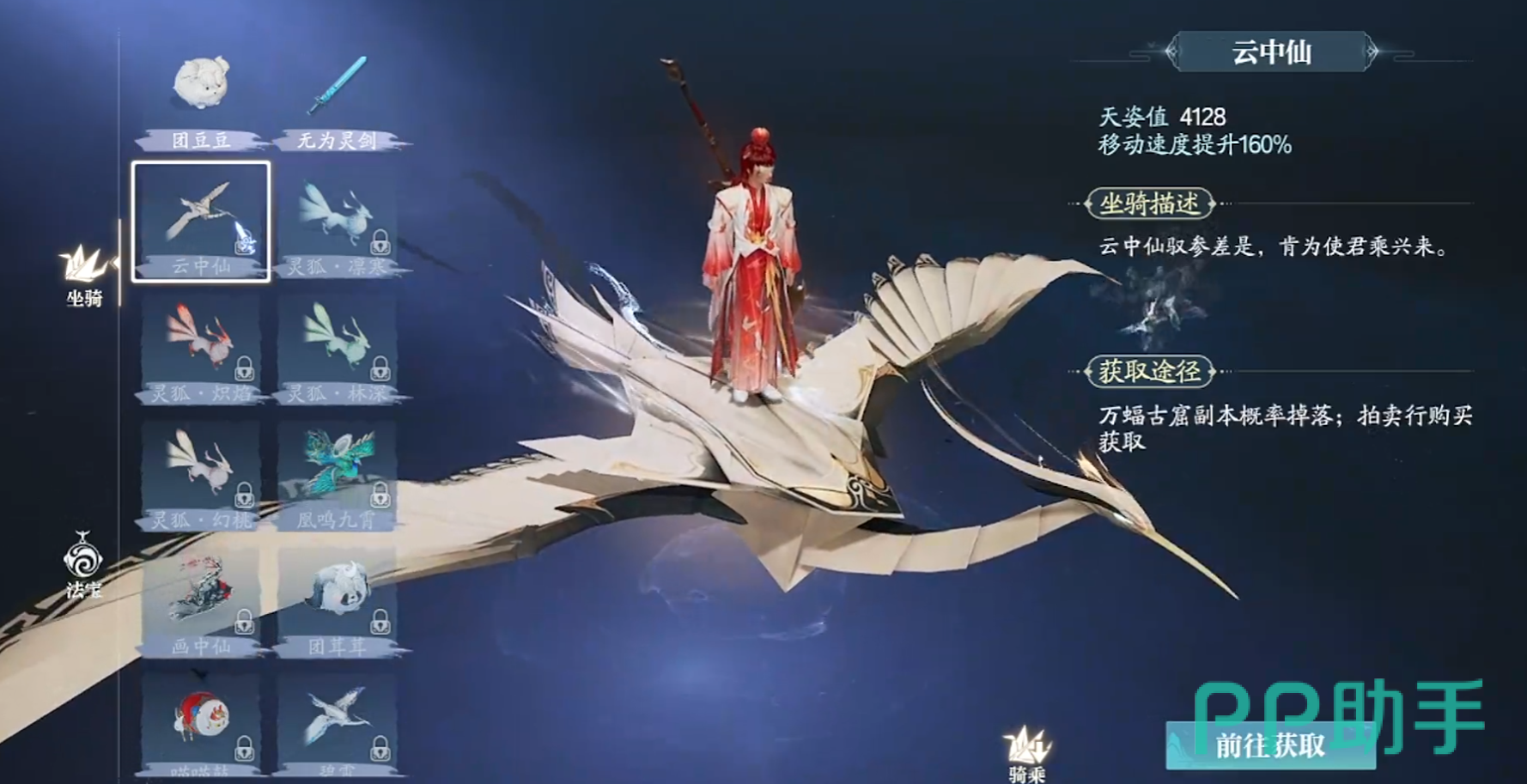 云中仙拥有4128点天资值,可为角色提供160%的移速加成。其外形如同一只展翅高飞的巨型仙鹤,充满东方仙气。想要获得该坐骑,可通过挑战万蝠古窟副本,有一定概率掉落相关材料或直接获取;此外,也可在交易行中使用资源兑换。