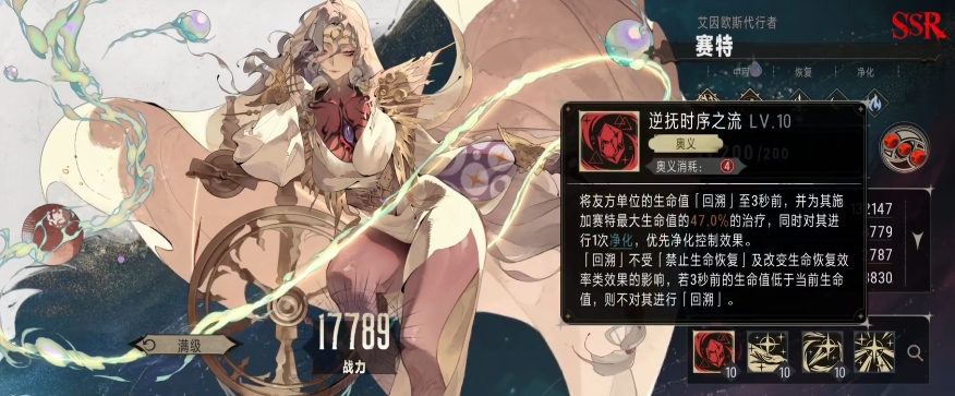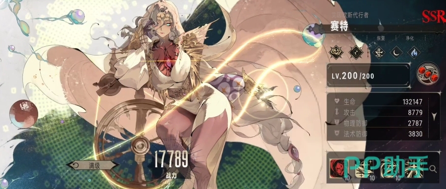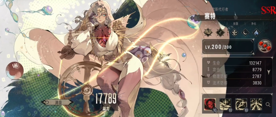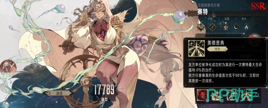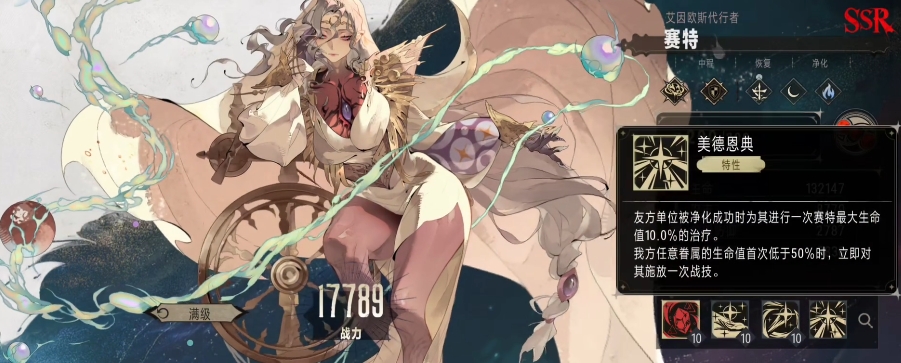 然而赛特的自身特性却远非如此简单,她的自身特性有着独特的机制,当友方单位被净化成功的时候,赛特就会触发一次治疗动作,按照自己最大生命值的 10%来为该友方单位恢复生命值,这一特性使得赛特在与具有净化能力的队友配合时,能够形成一个有效的生命保障体系,不仅如此,当我方任意一名成员的生命值首次低于 50%的时候,赛特还能够立即对其释放一次战技。