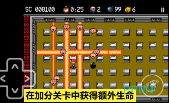 这款画面就比较经典的游戏,会让玩家展开一段,以炸弹人展开探险的旅途游戏,还有丰富的故事情节。在被判入狱以后,玩家需要控制里面的炸弹人,顺利的逃离监狱。在玩的过程中,屏幕上会有上下左右这样的按键,通过点击4个方向,利用各种障碍物摧毁,将敌人杀死,提供很多的宝藏,通过得到以后能使炸弹,发挥更强大的能力。