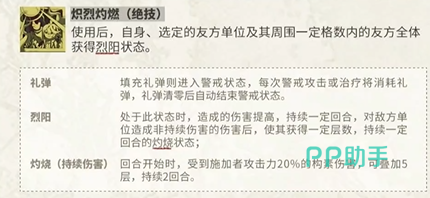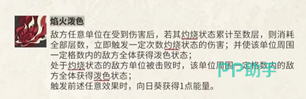 被动技能“焰火泼色”进一步强化了她的范围打击能力。当敌人的灼烧层数达到上限时,所有层数将被清除并立即触发额外伤害,同时波及周围单位,实现范围清伤。此外,每当有敌人被击败时,附近的敌方目标也会被施加灼烧效果,极大提升了清场效率与连锁反应能力。
