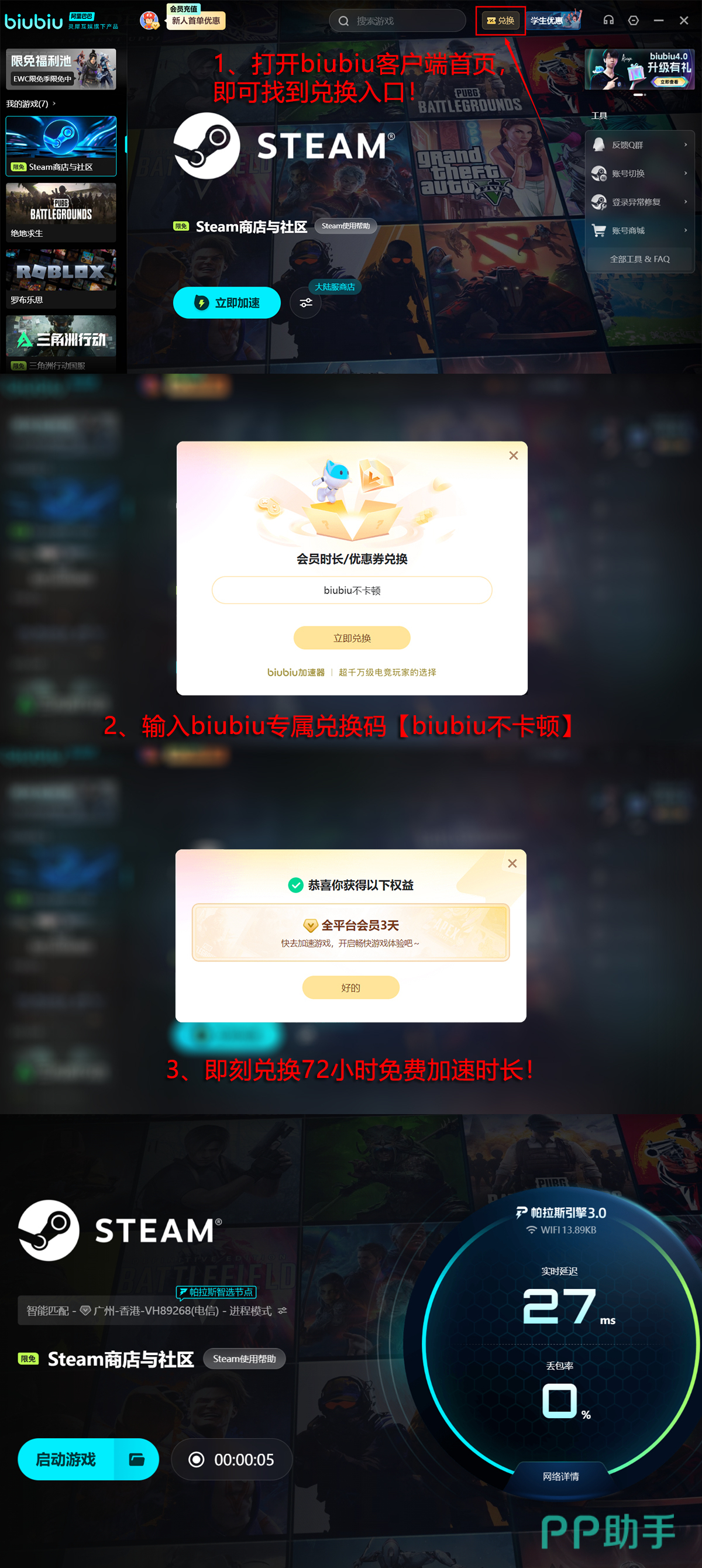 新用户注册即可获得24小时免费加速时长。此外,无论是否为老玩家,只要输入兑换码【biubiu不卡顿】,即可额外领取3天加速服务,助你在体验《第九圣诗》的过程中远离卡顿与掉线。