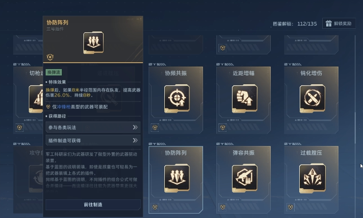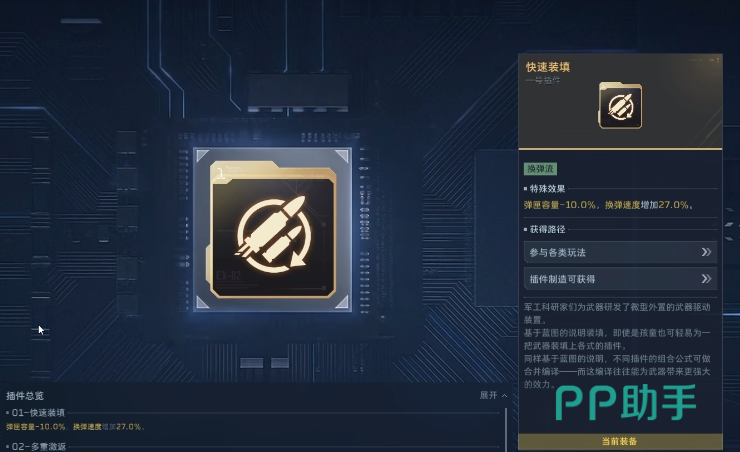 相较而言,武器插件更侧重基础性能的直观强化。该系统具备跨武器类型兼容特性——无论冲锋枪、突击步枪还是狙击平台,均可安装通用插件。常见功能包括提升弹匣容量、缩短换弹时间、增强后坐力控制等。其中金色品质插件代表当前最高性能层级,例如编号为“2号”的【闪身】插件,可将原武器主动技能完全替换为短距位移冲刺,并同步附加移动中减伤与命中反馈强化效果,大幅优化近身突袭效率。