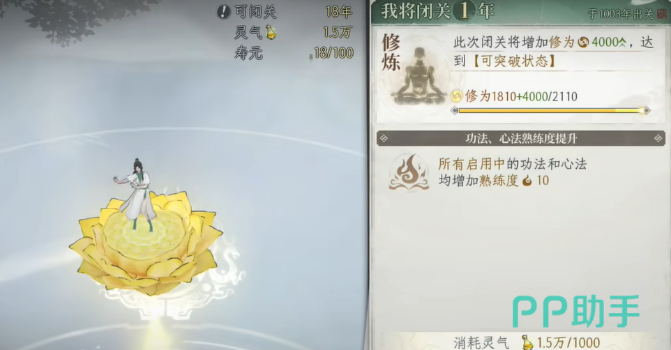 大世界设计强调高自由度与强探索性。广阔地图中分布着大量动态奇遇任务,完成即可开启宝箱,内含稀有装备、限定皮肤等战力强化道具。同时,宝箱与事件产出的灵气直接关联角色成长节奏:当灵气值累积至阈值,即可触发境界跃迁;每次演化需消耗精元,演化结束后将自动恢复固定数值精元。闭关修炼是加速精元回满的关键路径,但受角色当前年龄限制,玩家可通过消耗寿元丹解除部分闭关条件约束。