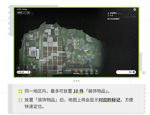 在布置规则方面,系统设定单个区域最多容纳10件装饰物品,达到上限后将无法继续新增。建议玩家在部署前统筹规划,优先保留具有视觉辨识度或情感联结的位置。所有已放置装饰物均会在地图上生成专属标记点,支持一键定位,避免因数量增多导致查找困难。