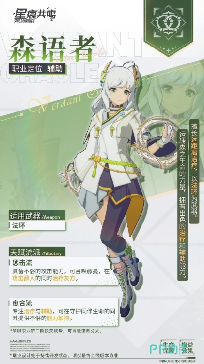另一边森语者则肩负着团队唯一治疗的重任,其吉他奶流派完美融合了群体治疗与增益辅助的双重功能,生命绽放技能能够瞬间抬升全队血量,「复苏之种」更是赋予复活队友的关键能力,而大招狂野绽放则将治疗与范围伤害相结合,提升了团队的整体容错率,不过由于自身输出能力较弱,日常资源获取速度较慢,通常需要搭配一个输出型第二职业来弥补这一缺陷。