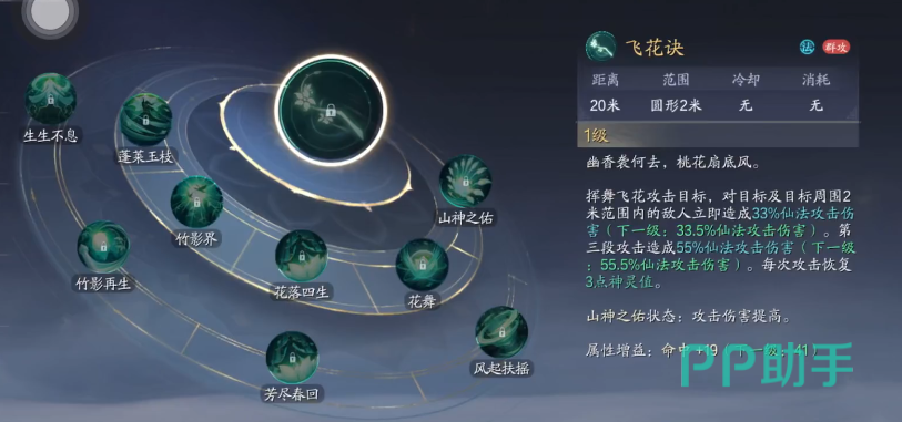 花落四生是神祝的主要单体治疗技能,治疗量基于角色自身的仙法攻击倍率计算,随装备成长而同步提升。系统默认优先锁定血量最低的队友,紧急情况下可快速救场。进入山神状态后,该技能升级为芳尽春回,不仅基础回复量显著提高,还额外附加3秒持续治疗效果,形成双重恢复机制。若未手动指定目标,技能将自动识别最危急单位进行救治,智能化设计降低了操作门槛,提升了实战响应速度。