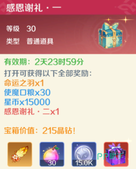 当角色升至30级时,系统将发放一个名为“感恩谢礼”的奖励礼包。该礼包具有三天有效期,若未在倒计时结束前开启,内容将会自动失效。礼包内含命运之羽毛、使魔口粮及多种基础货币,总价值相当于215晶钻,对新手期发展极为重要。首次打开后,还可使用绑定钻石解锁第二阶奖励,性价比突出。第三阶奖励所需绑定钻石较多,建议根据个人资源情况决定是否解锁。