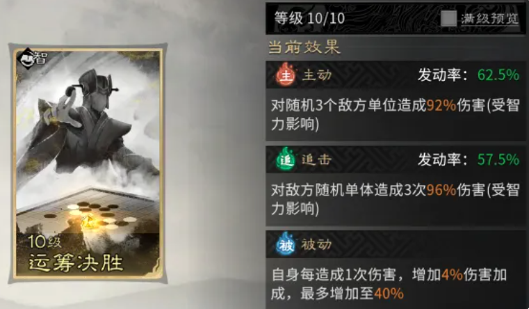 诸葛亮追击技推荐“运筹决胜”:每次受到伤害可提升4%伤害,叠满10层(即40%)后,其单次技能爆发与追击输出能力跃升至顶级水准。该增益与“料敌机先”的智力压制、董卓的统率转移、贾诩的混乱蔓延形成四维压制,使敌方既难以站桩输出,亦无法有效解控,战斗节奏完全由我方掌控。