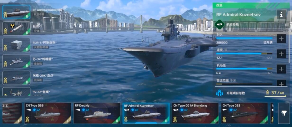 库兹涅佐夫号属于团队型船,单挑弱但团战能扛能打。也是航母的常规舰载机玩法,多利用地形和队友配合。重点养导弹和飞机,防空升到蓝色够用,熟练后能在高端局当工具人。
