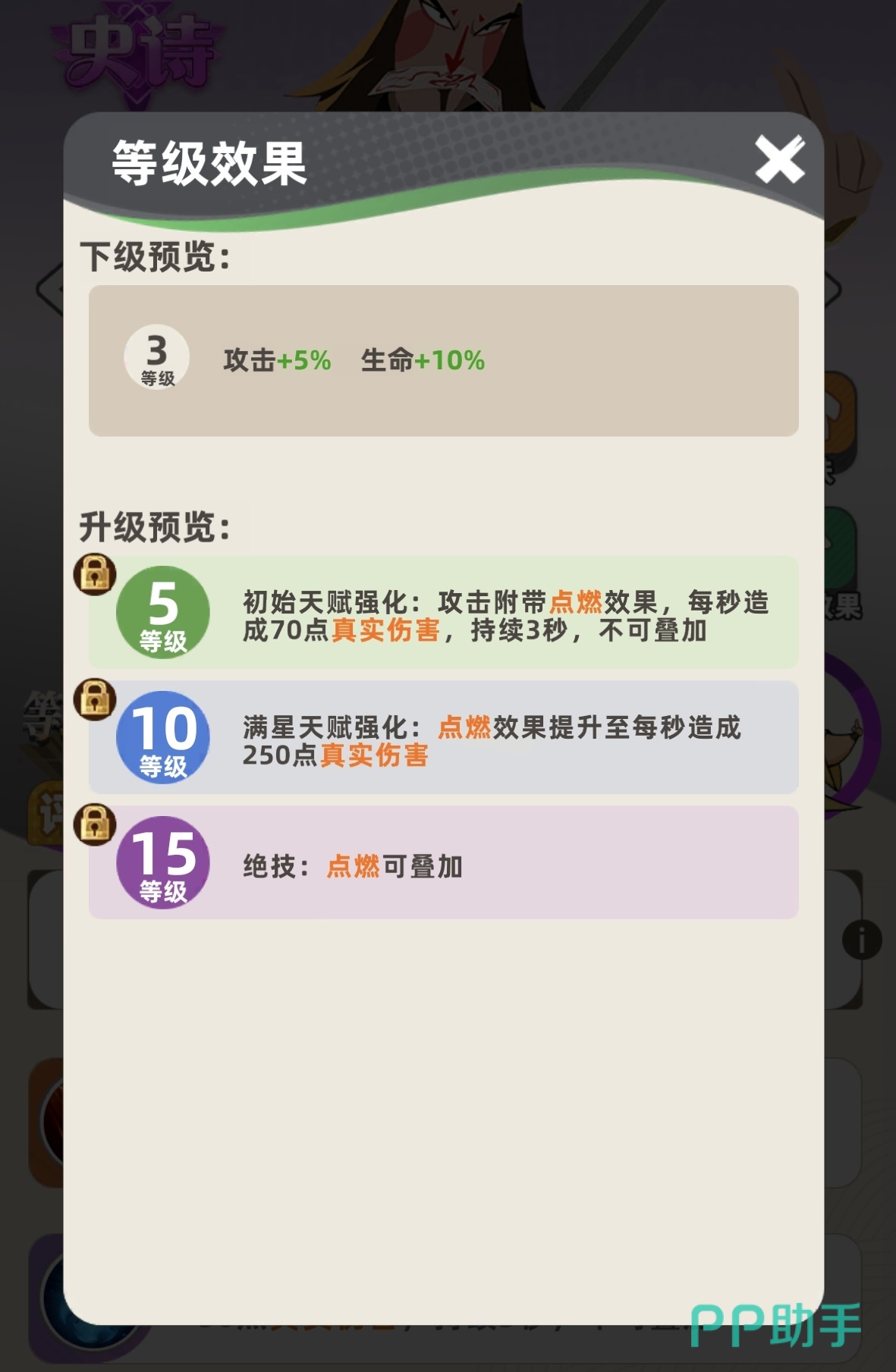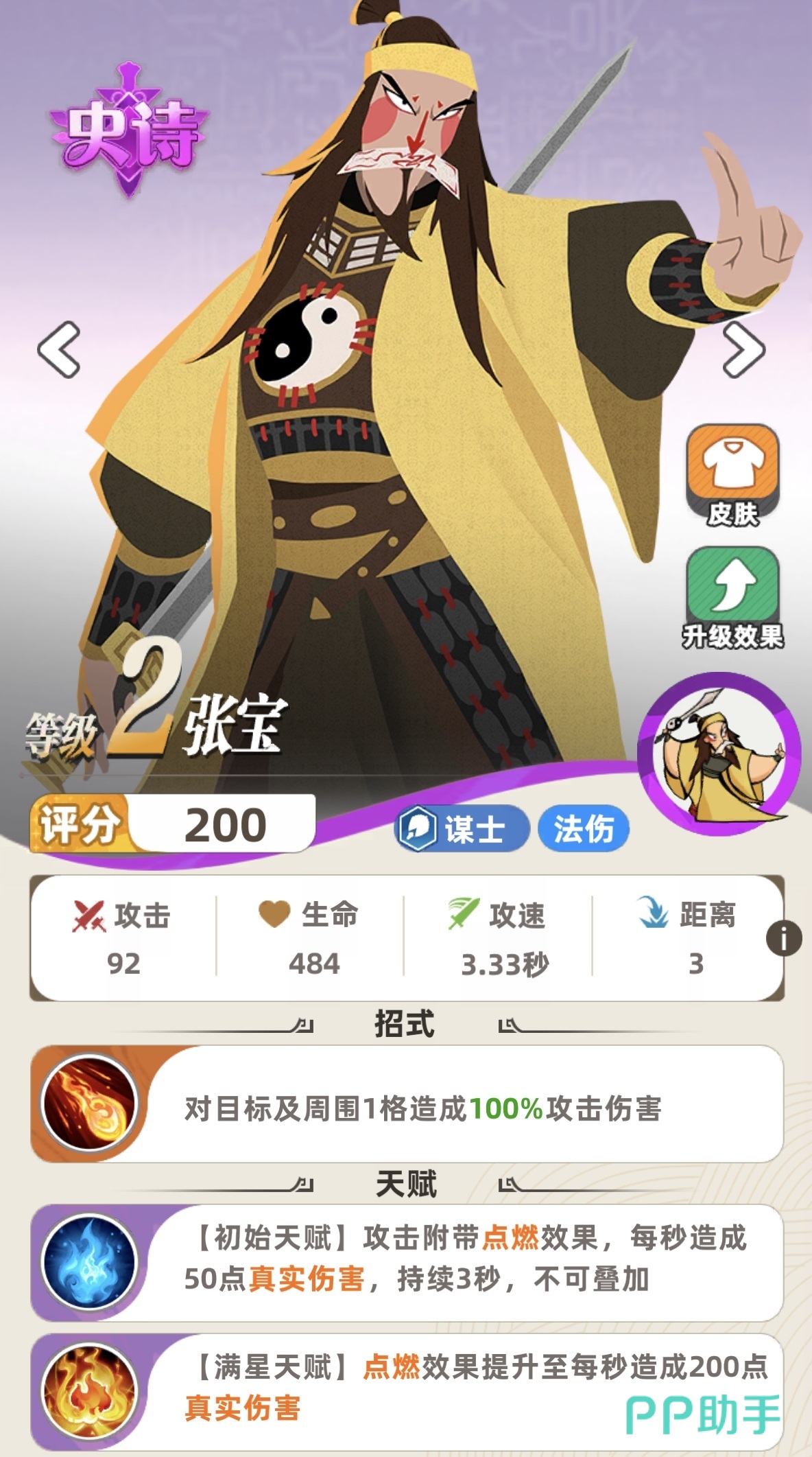 张宝的核心机制在于其天赋被动——每次普攻可触发“点燃”效果,对目标施加持续真实伤害。该效果随星级提升而强化:升级后每秒真实伤害数值提高;满星状态下,“点燃”可多层叠加,使敌方单位在持续作战中承受指数级增长的灼烧压力。这一特性使其成为持久战与消耗战中的关键输出支点。值得注意的是,英雄强度不唯品阶论,实战表现更取决于技能适配性与阵容兼容度。