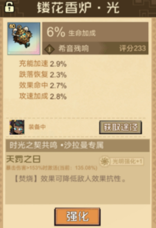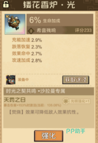 沙拉曼作为火队核心输出成员,其专属残响为「希音」,需装配「镂花香炉」激活。该残响提供6%生命值加成与充能加速效果,并在承伤时概率触发控制反制。当与「时光之契」共鸣中的「天罚之日」协同生效时,可大幅提升暴击伤害倍率,并优化火系技能链的衔接流畅度,确保多段灼烧与连携技稳定释放。