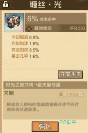 霍夫曼的专属残响为「藏薇」,需通过装备「缠丝光」触发。该残响提供6%命中率提升,并同步降低技能冷却时间、提高攻击速度,显著强化其前排控场节奏。配合「时光之契」共鸣体系中的「时光之契」效果,他在施加眩晕、冻结等控制状态时,可额外转化为可观的持续伤害输出,使控制型角色兼具功能性与爆发潜力。