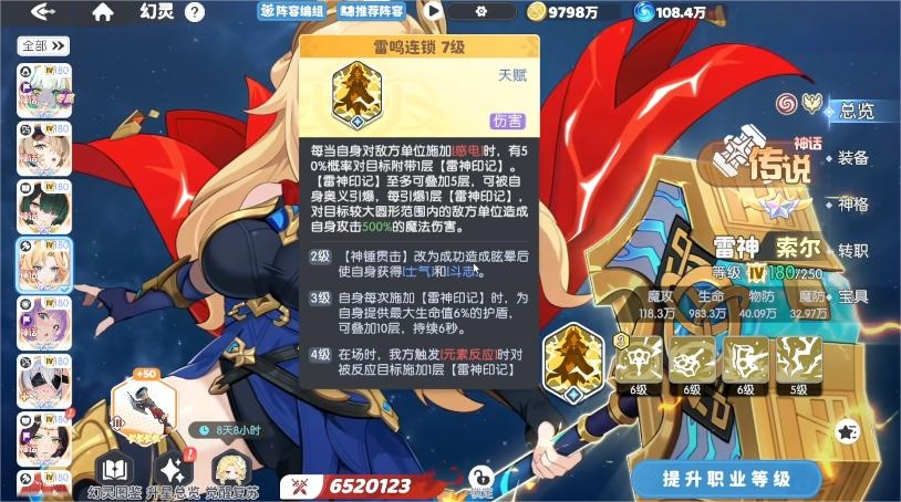 天赋技能【雷鸣连锁】为核心机制之一:每次对敌方单位施加感电状态时,自动附加1层雷霆印记;叠满5层后触发范围引爆,造成高额群体伤害。该技能强烈建议升至满级以最大化收益。主动技能【神锤贯击】具备稳定眩晕控制,并在命中后提升士气与斗志属性;每次成功叠加印记还可获得基于最大生命值的护盾,且在元素队列中同样可正常触发印记效果。