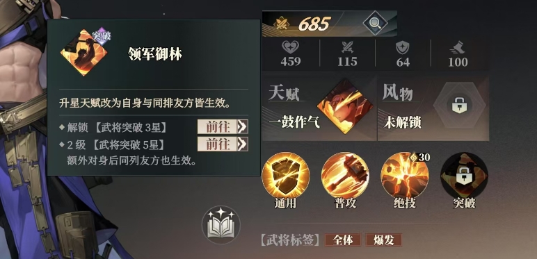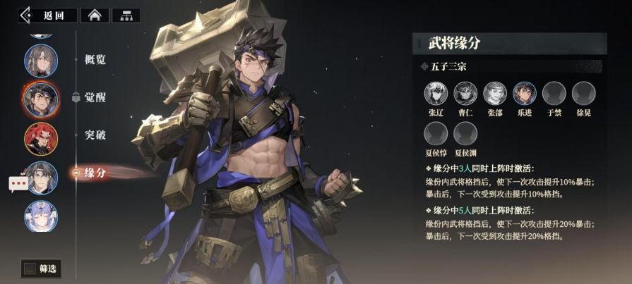 他可以与五子三宗中的张辽、曹仁、张邰、于禁、徐晃、夏侯惇、夏侯渊等七位武将之间一起组合上阵,这样就可以触发羁绊的效果,这种羁绊是当这七位武将中的任意三人与乐进携手踏上战场时,在战斗的关键时刻,每当有武将成功地格挡敌人的猛烈攻击,那么该武将在接下来的出击中将会附带10%的暴击加成,这一加成效果会让队伍之内的输出角色每一次攻击都更具杀伤力,且数值也是比较高的。