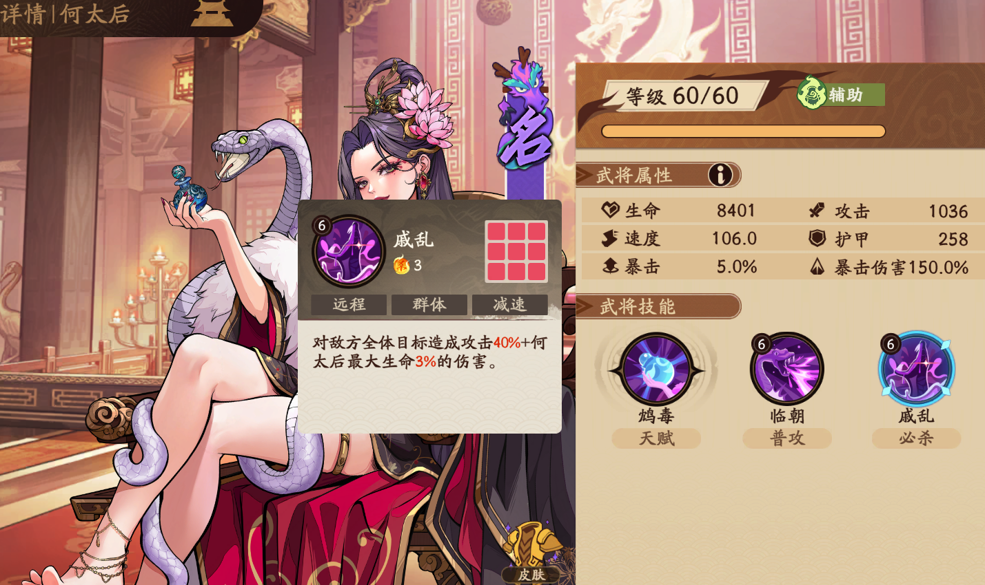 何太后属于紫色品质名将,职业定位为后排辅助型角色。其初始速度属性高达106,在全服同阶武将中处于第一梯队,这使其能稳定抢得先手节奏,尤其利于在毒系阵容中提前铺垫减防效果。推荐养成路径以生命值与速度双维度为核心——高生存保障持续站场,高速度确保技能释放频率,契合其“拉锯战核心辅助”的战术价值。