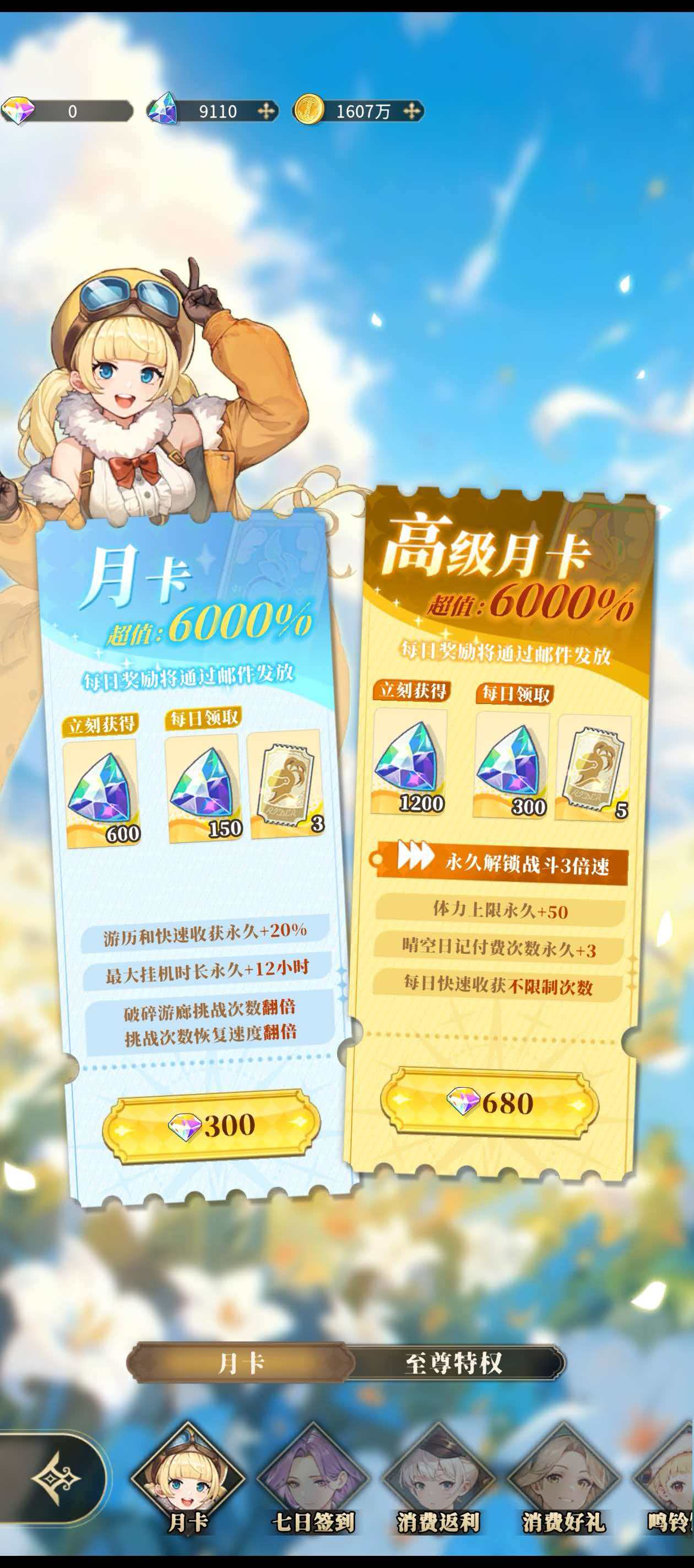 包含月卡(30元)与高级月卡(60元)两类订阅服务。月卡生效后,永久提升游历效率与快速收获速度20%,挂机市场时长+12小时,挑战次数×2;高级月卡进一步提供永久3倍快速战斗权限、体力上限+50、晴空日记付费次数+3、每日快速收获无次数限制。另含至尊特权选项,可永久增加战斗刷新次数+5、解锁风暴之源最高成绩扫荡、竞技大会快速挑战资格、寻星奖章数量+2及自动选卡功能。