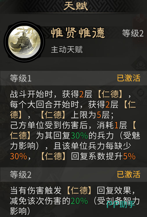 刘备的核心技能为“仁德”,具备出色的支援与反制效果。当己方单位受到攻击时,会消耗一层仁德层数,恢复相应的兵力与生命值。同时,刘备的二阶技能可使全队所受伤害降低20%,显著提升整体生存能力。当该技能升至3级后,效果产生质变——不仅能继续保护己方,还可将仁德状态转移至敌方目标。每当敌方对友军造成伤害时,便会叠加一层仁德印记,最多叠加4层。一旦叠满,目标将进入“罚站”状态,无法执行下一次行动。这一机制有效遏制了依赖连击或群体爆发的敌人,打断其输出节奏,为我方争取关键反击窗口。