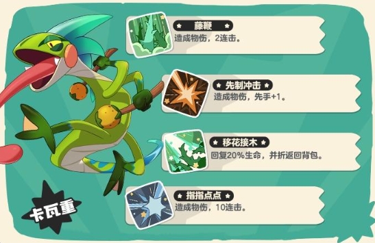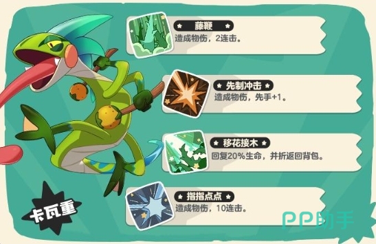 在物理技能方面,藤鞭是一种经典的双重攻击技能,适合在战斗开始时稳定地输出伤害;而先制冲击则具备+1的先手效果,能够帮助卡瓦重抢占先机,迅速压制对手。对于需要保命的情况,移花接木是一个非常实用的技能,不仅能够恢复卡瓦重20%的生命值,还能将其撤回背包,避免被击败。最后,指指点点是一个10连击技能,累计伤害极高,同时还能够针对对手的被动特性,是一个非常灵活的技能选择。