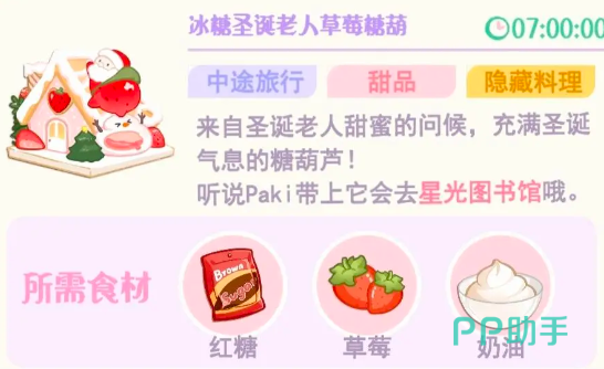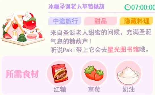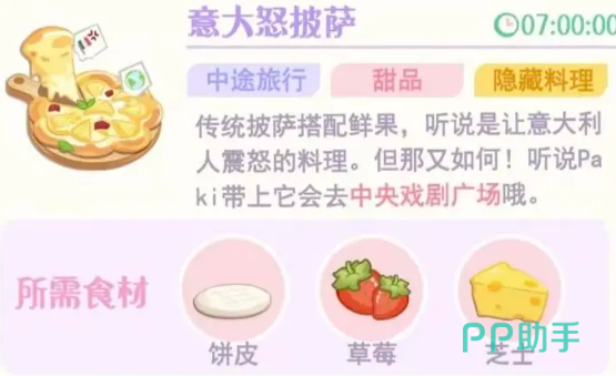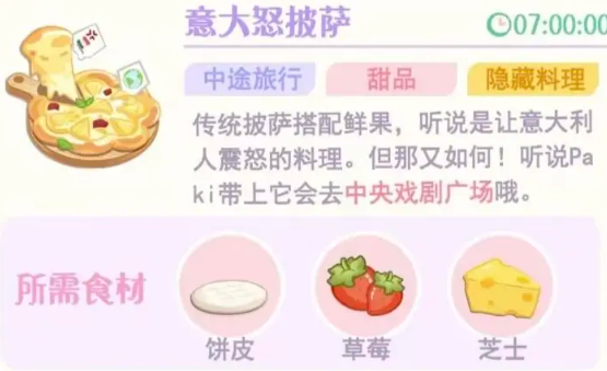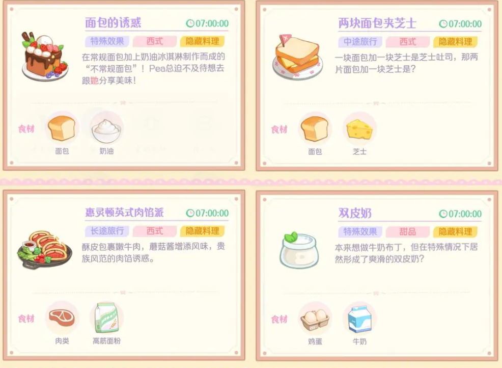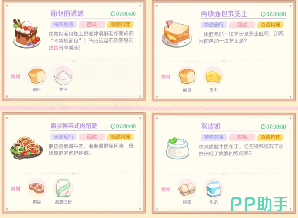 然后就是七小时的隐藏料理,需要七小时的烹饪时间,非常多,小编一个一个的介绍给玩家们,双皮奶需要鸡蛋和牛奶,广式烧卖需要饺子皮和猪肉,蛋可丽饼需要三种食材,分别是饼皮、肉馅和鸡蛋,焦糖双皮奶在双皮奶的基础上加上红糖就可以了。
