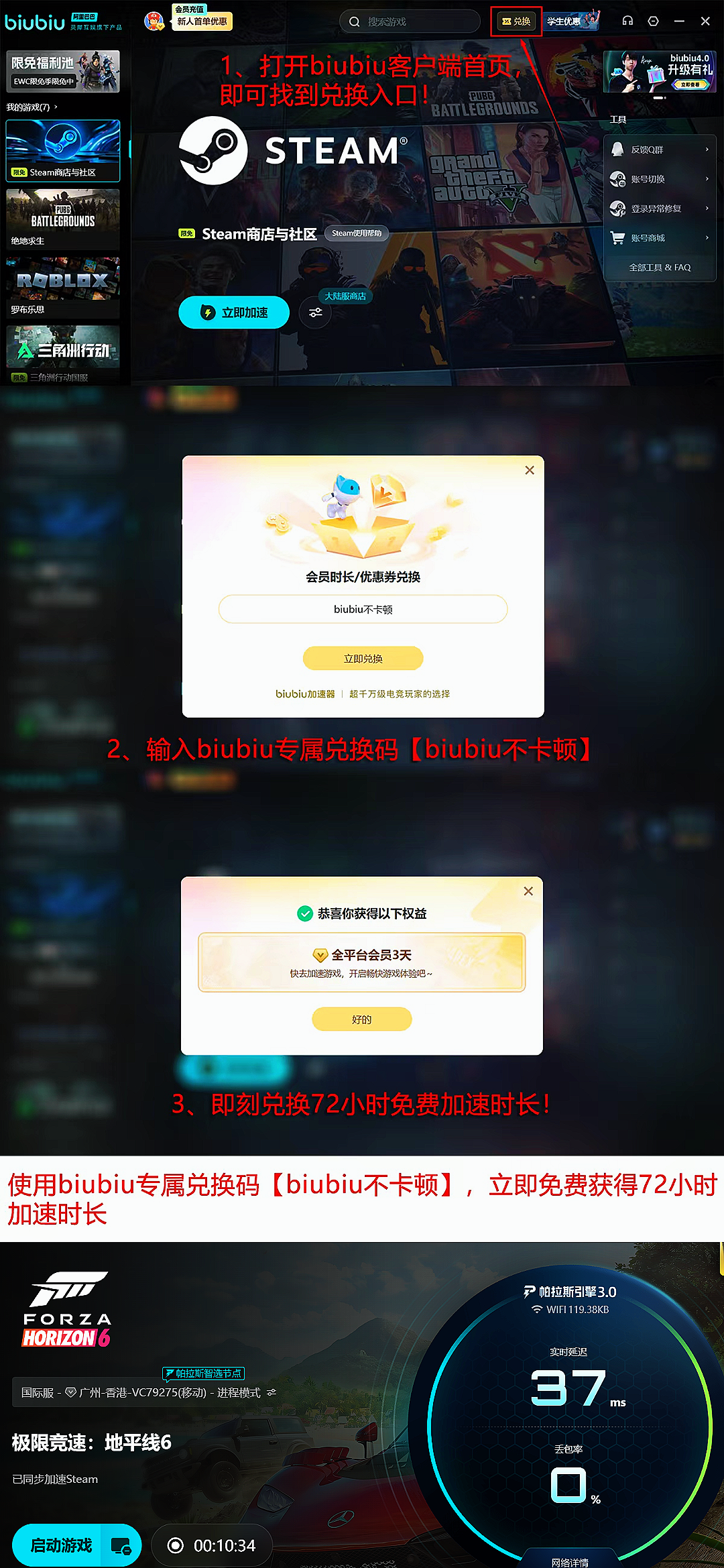除性能优化外,biubiu加速器同步提供实用新人权益:注册即享24小时全游戏免费加速服务;所有用户输入兑换码【biubiu不卡顿】,均可额外获得3天加速时长;新用户最高可累计领取总计96小时的免付费加速权限。