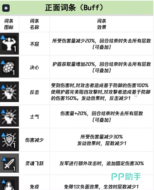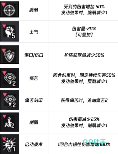 负面词条即各类减益效果,共包含五个核心属性。“易伤”类包括脆弱与痛苦,前者会提高角色所受伤害,后者则附加持续性固定数值伤害,两者叠加将极大削弱单位耐久。“削弱士气”涉及士气降低与削弱状态,可使角色输出减少25%,且技能触发时消耗一层增益层数。“护盾限制”以“损坏”为核心,导致角色获得的护盾值降低50%,从而显著削弱防护能力。