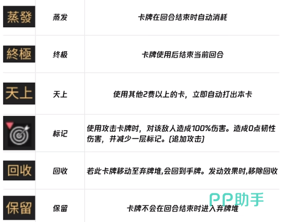 机制类词条依据不同英雄设计而异,体现为独特的战斗运作方式。卡牌机制包含蒸发、终极与回收三种属性,各自影响卡牌使用效率与资源循环节奏,需根据战场形势灵活选用。角色专属机制如余烬、上膛与狩猎启动,则提供更多战术维度:余烬可在生命耗尽后保留部分战斗力;上膛提升下一次攻击威力;狩猎启动则可在队友命中目标后触发追加伤害,强化团队输出连贯性。