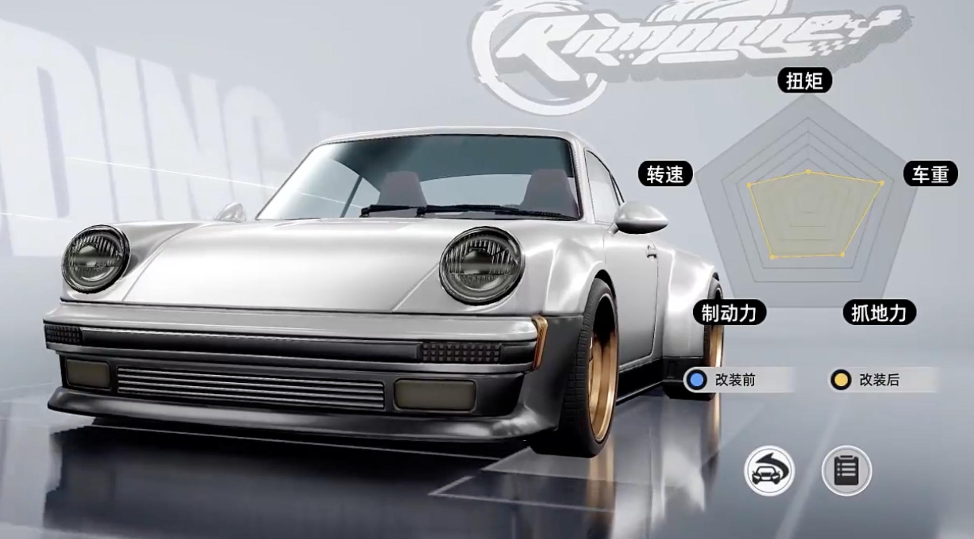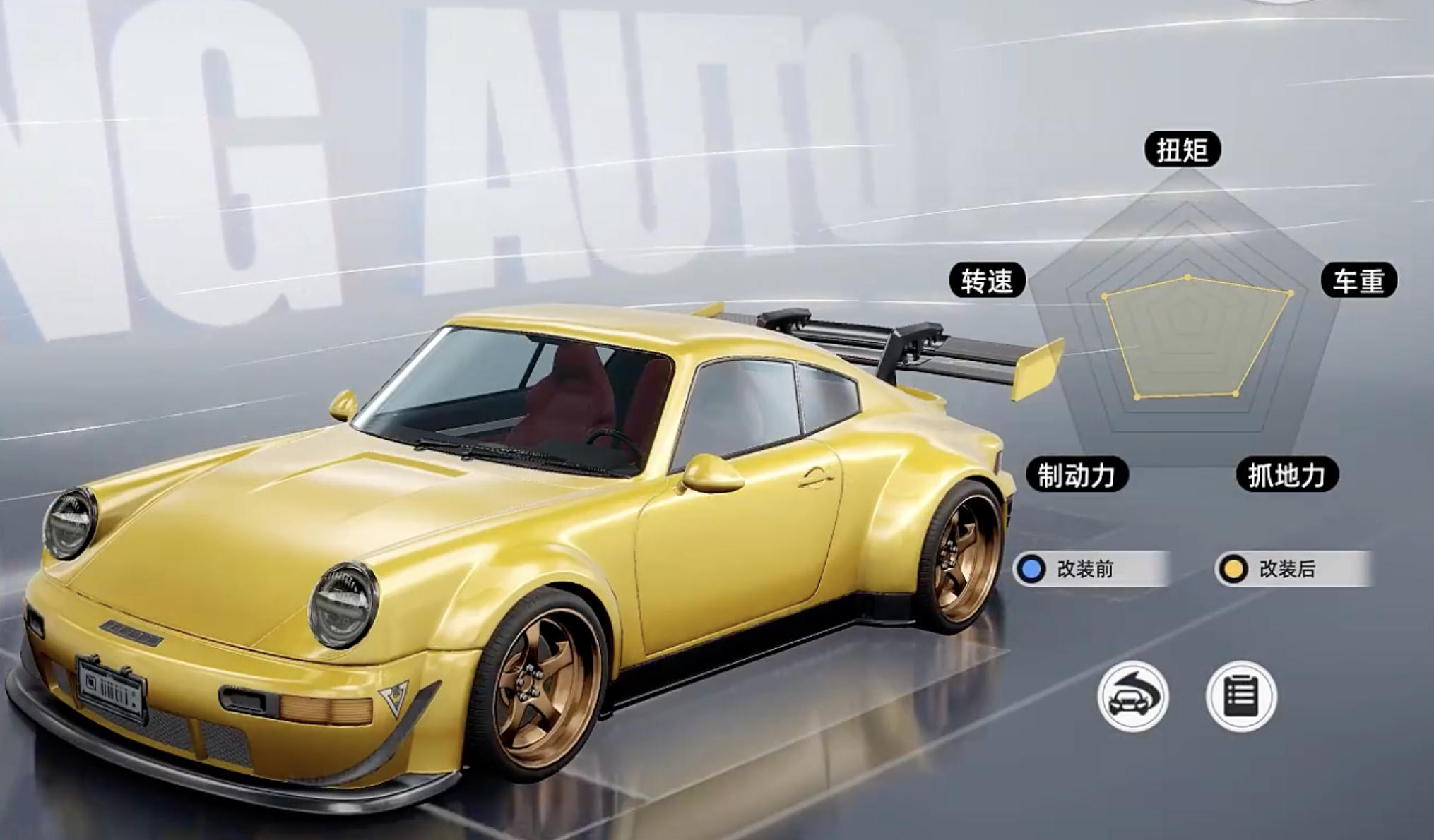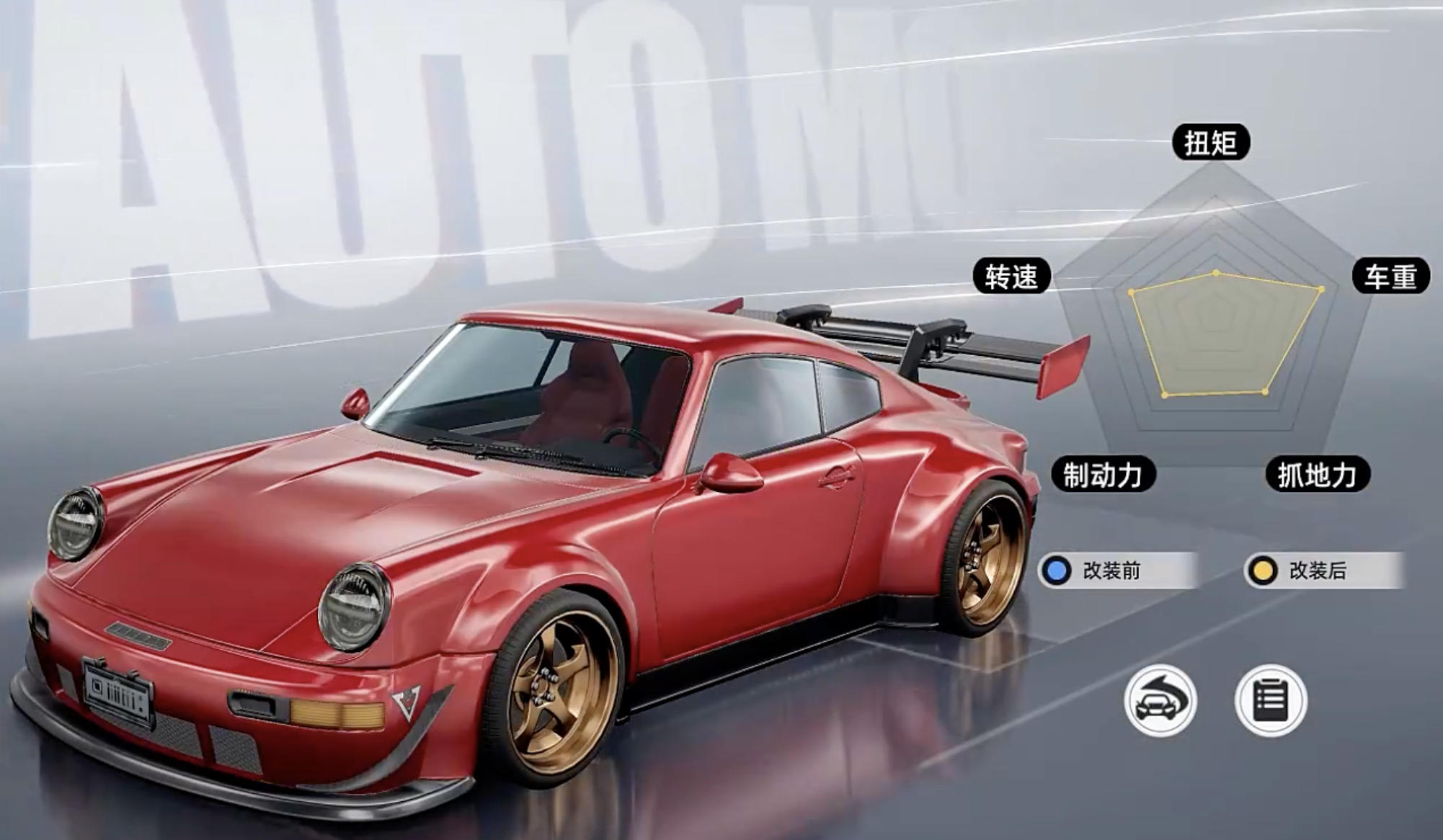 真正决定比赛胜负的是性能层面的优化。影响车辆操控的关键指标包括抓地力、制动力、转速、扭矩以及车重。高抓地力意味着弯道行驶更稳定;强制动系统可缩短刹车距离;转速与扭矩共同决定加速响应与冲刺能力;车重则会影响整体操控手感——过重则迟缓,过轻则易飘移。每项改装部件都会对这五项数值产生具体影响,玩家可通过五维图清晰对比各项改动带来的变化。